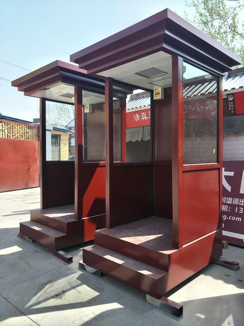 值班崗亭的主要龍骨為鋼結構龍骨,起尺寸為40x60x1.5mm鍍鋅龍骨;立柱一般為堅固耐用的型鋼,尺寸規(guī)格有80x80x2.0mm,40x80x2.0mm等等,可根據產品的大小不同而來決定立柱的大??;玻璃一般為8mm鋼化玻璃,具有較強的抗沖擊力,即使破碎也不會傷到人;地板為3mm防滑鋼板,鋪紅色地毯,四周可用鈦金立柱和紅絨繩作為裝飾件,使產品看起來更美觀,大氣,高檔。